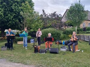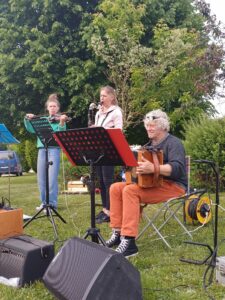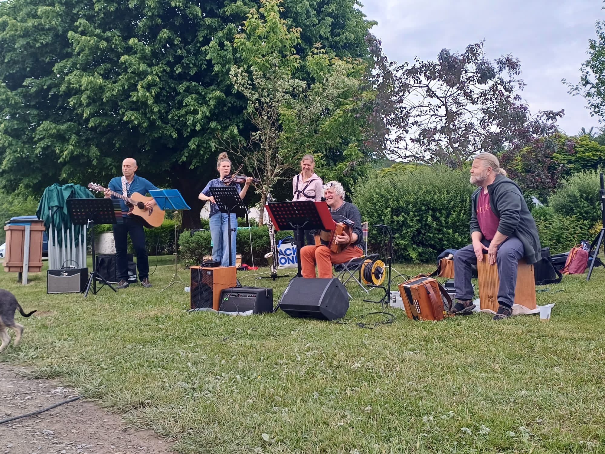 Ben Urbany ayant racheté le diato de Christine, il me semblait logique de lui demander de se joindre à nous. Le groupe se compose aujourd’hui de 6 musiciens : Mathilde et Chloé aux violons ; Séverine aux clarinettes ; Jean-Marie Marsin à la guitare ; Ben Urbany au diato et au cajon ; Jean-Marie Paque au diato, à la guitare et au chant.