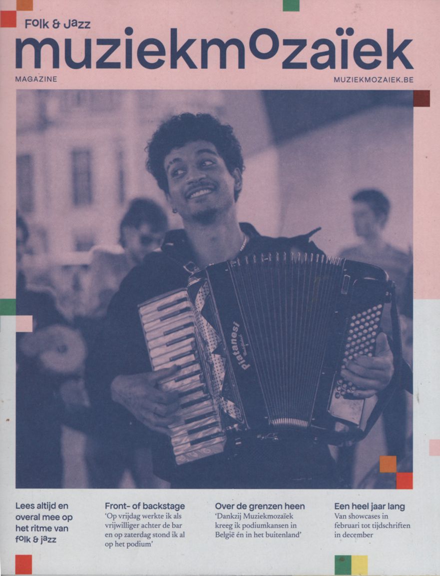 Le luxueux mais classique magazine « Folk » de Muziekmozaïek laisse la place au trimestriel « Muziekmozaïek magazine – Folk & Jazz ». Le format inhabituel accueille de grandes et innovantes illustrations qui soutiennent des messages relativement brefs. Percutant et porteur de sens, c’est une révolution graphique mais aussi une vue ramassée des principales activités de Muziekmozaïek, renforçant un sentiment d’unité de l’offre.