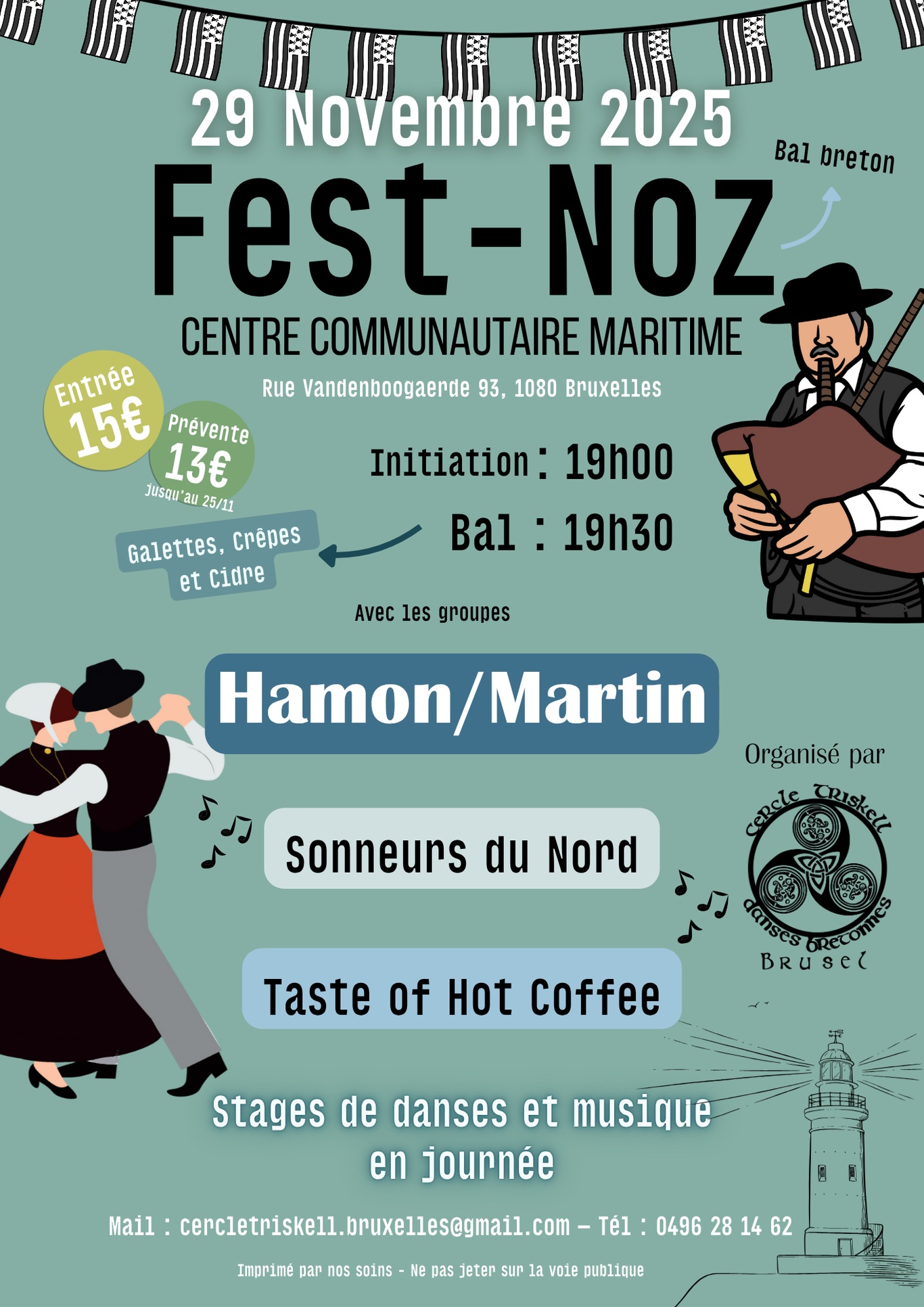 19h30 fest-noz (bal breton) avec TASTE OF HOT COFFEE, LES SONNEURS DU NORD et le duo Erwan HAMON & Janick MARTIN (BZH).