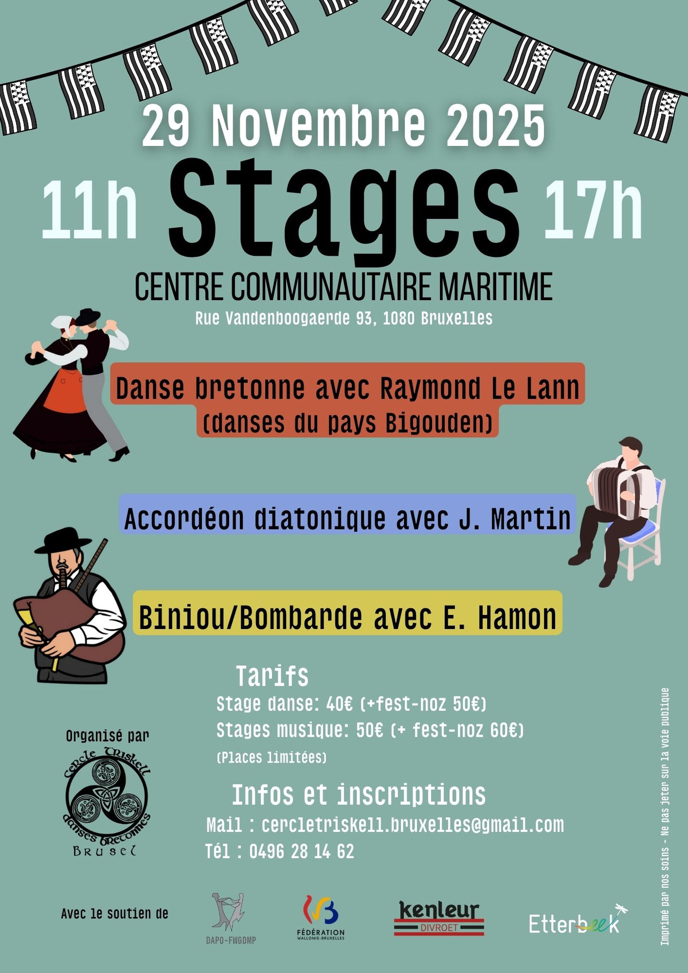 Stages de danses bretonnes, d’accordéon diatonique et de biniou/bombarde + grand fest-noz, organisés par le Cercle Triskell le samedi 29 novembre à Bruxelles.