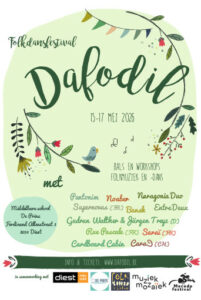 Le nom Dafodil est une trouvaille de Pascale Rubens de Naragonia. Elle était membre de notre équipe parce que Dafodil est le successeur du festival Larenfolk qui a eu lieu chez Toon et Pascale, dans le grand jardin derrière leur première maison. Dafodil veut dire (en néerlandais) : DAnsen op FOlkmuziek in Diest in de Lente – Traduction : Danser sur de la musique folk à Diest au printemps. Il y a naturellement aussi le lien avec la fleur anglaise daffodil (jonquille).